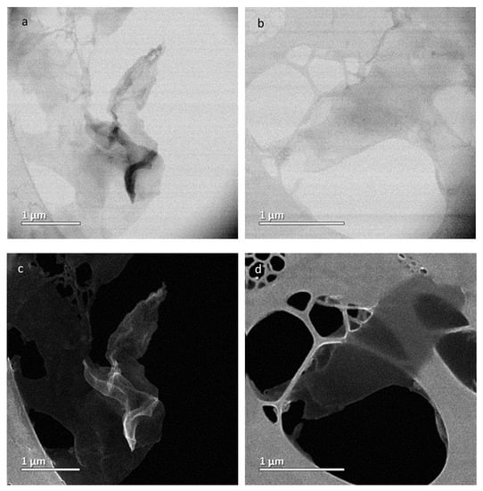To demonstrate the successful synthesis of GONRs, HRTEM and FESEM imaging studies were performed. Shown in Figure 1a,b is various images of the GONRs. As demonstrated, the unraveling process of the MWCNTs was observed, where sheet like structure were present. As shown in Figure 1c,d, the FESEM of graphene nanoribbons continued to appear as sheet-like structures compared to the tubular structures observed in MWCNTs (shown in Figure S6, in the Supplementary Materials) which was similar to what was previously observed [15]. Thus, demonstrating the synthesis of GONRs was successful.