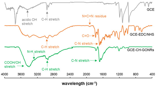 The FTIR spectra of GCE (grey), GCE post 1-ethyl-3-(3-dimethylaminopropyl) carbodiimide hydrochloride (EDC)/NHS activation (orange) and GCE-EDC/NHS-CH-GONR (green).