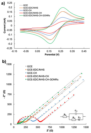 To monitor the modification process as well as the electrochemical activity of GCE/GONRs-CH, CV and EIS were performed. In Figure 3, the bare GCE showed an anodic and cathodic peak for [Fe (CN)6]3−/4− at 0.27 V and 0.15 V (vs. Ag/AgCl), respectively (Figure 3a). CV of the modified GCE with EDC/NHS was similar to GCE but when the GCE modified with CH and EDC-NHS-CH, the anodic potential increased with a decrease in the reduction potential for both modified electrodes but the increasing anodic potential for GCE/EDC-NHS-CH was more than that of GCE-CH. This result supported the successful attachment of CH on GCE surface. The GCE/GONRs-CH displayed an obvious increase in anodic and cathodic currents while confirming the incorporation of GONRs in CH. EIS (Figure 3b) was also performed after the CV scans, and the results are displayed as Nyquist plots fitted with a modified Randles equivalent circuit. Firstly, for bare GCE and the modified GCE with EDC/NHS amine coupling agents, the corresponding charge-transfer resistance (Rct) values showed no observable differences. After the incorporation of CH on the surface, the Rct increased. This was expected as CH was not modified with any redox-active components. This was reflected (as shown in Figure 3b) in the corresponding Nyquist plots, where an increase of Rct from 473.47 Ω to 180.14 Ω was observed for GCE-CH to GCE, respectively. For the GCE where the surface was activated with EDC/NHS and CH was introduced, the Rct further increased. This suggested that the amine coupling reaction allowed for more CH to attach to the electrode surface. Lastly, the modified GCE/GONRs-CH displayed a decrease in Rct with an increase in the current density in CV study. This was attributed to the electrocatalytic property of GONRs to facilitate electron transfer.