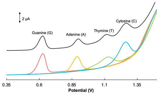Deoxyribonucleic acid (DNA) bases are the fundamental building blocks of all life. There are four naturally found bases, with two subgroups. Guanine (G) and adenine (A) are in the group of purine bases in which the structure contains an aromatic pyrimidine ring fusing with an imidazole ring [1]. The second subgroup is the pyrimidines which are thymine (T) and cytosine (C), which only contain an aromatic pyrimidine ring within its structure [2]. By varying the sequence of these four bases, proteomic, metabolomic and physiological information can be stored and recalled at any time. In the human genomic sequence, if a mutation or damage occurs within the sequence it can lead to detrimental diseases such as cystic fibrosis, sickle cell anemia and Alzheimer’s disease [3,4,5]. Furthermore, many discovered disease pathogenesis pathways have a high correlation to mutations that occur within the genetic makeup. Thus, it is of a great interest to develop a biosensing platform that allows the analysis of the DNA bases.