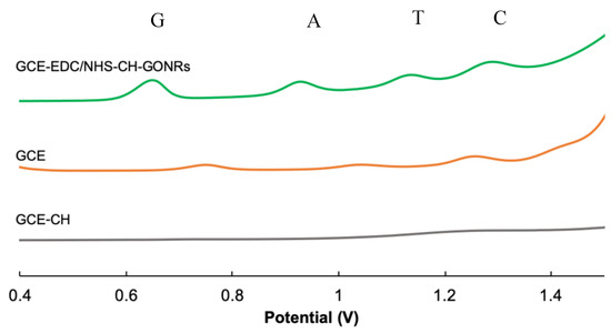 As shown in Figure 5, when detecting four nucleobases using a bare GCE, low and board peaks were recorded for the nucleobases. With the incorporation of the CH at GCE/CH, the peaks for the nucleobases completely became non-observable. This was expected as CH did not have redox-active components incorporated to facilitate the electron transfer. Finally, at GCE/GONRs-CH, the peaks for the four nucleobases became observable. Henceforth, the modification of GCE with GONRs-CH nanocomposite was shown to greatly enhance the electrochemical performance.