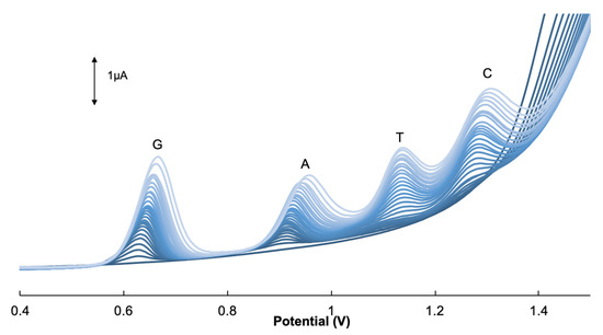Differential pulse voltammograms of GCE/GONRs-CH in the presence of mixed solutions with G (0.05–256 µM), A (0.05–172 µM), T (5.0–855 µM) and C (2.5–342 µM) in 0.1 M PBS (pH 7.0).
