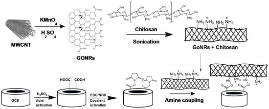 GCEs were first polished with alumina powder at different particle sizes of 1.0 µm, 0.3 µm and 0.05 µm for 15 min for each size. The polished GCEs were then sonicated in water to remove the excess alumina particles. The acid-activation then proceeded in 0.5 M H2SO4 in the potential range from −1.0 to 1.5 V at a scan rate of 100 mV/s for 30 cycles. After gently rinsing with water, the preparation of acid-activated GCEs was completed. The activated GCEs were modified with 150 mM 1-ethyl-3-(3-dimethylaminopropyl) carbodiimide hydrochloride (EDC) dissolved in water for 1 h, then dipped in 300 mM N-hydroxy succinimide (NHS) for 2 h and dried with flowing stream of N2 (purity 99.999%). The stock solution of CH (0.05% (w/v)) was prepared by mixing 500 mg CH powder in 1 L water and 10 mL acetic acid. The stock solution of CH was stirred for 1 h using a magnetic stirrer. The nanocomposite was prepared by mixing a desired amount of GONRs (2 mg) in 2 mL of CH followed by ultra-sonication for 10 min. The covalently-activated GCE surfaces were then modified by drop-casting an aliquot (20 μL) of the freshly prepared nanocomposite solution. The modification steps are illustrated in Scheme 1. The nanocomposite-modified electrodes were allowed to dry overnight at room temperature and then gently rinsed with water.