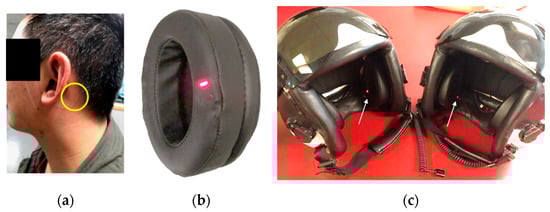 In order to further optimize PPG measurements at this location behind the ear, we developed an earcup-mounted device with a reflectance PPG sensor embedded within the ear-seal shown in Figure 1b,c, called SPYDR® (Standalone Performance Yielding Deliberate Risk). SPYDR employs an independently manufactured medical grade FDA-approved reflectance PPG sensor (OEMIII with 8000R reflectance sensor, NONIN®, Plymouth, MN, USA) that is multi-wavelength (660 nm and 980 nm as pre-calibrated by the manufacturer) within the ear-seal of ear-muff type hearing protection devices like those found in aviation headsets and helmets (Figure 1c). While embedded in the ear-seal, the sensor is up against the skin, with nothing else between the sensor and the skin. Soft black padding surrounds the sensor to prevent light leakage and maintain comfort of wearer as the sensor is held against the skin. This form factor alleviates issues with sensor application and contact with the skin. We custom fabricated the ear-seals to comfortably house the sensor such that it is held firmly against the wearer’s head behind the ear, in the specific location described above, in a self-contained unit housing the PPG sensor, battery, signal processing unit, and solid-state data storage. The SPYDR device in this study was installed within a military flyer’s helmet, such that it aligns with the helmet’s primary rotational axis and cranial support points, further reducing motion artifacts, but the sensor suite has potential for other applications as well.