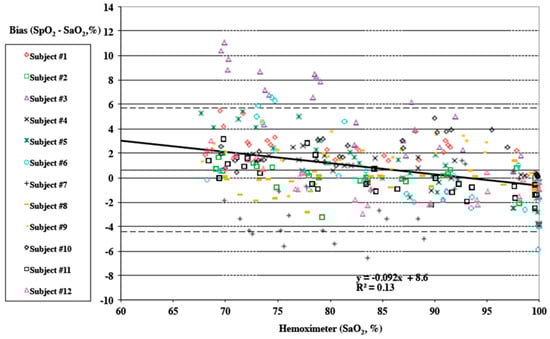 All data was independently analyzed and reported by the Hypoxia Research Laboratory at UCSF. Tables of mean, standard deviation, standard error, minimum, maximum, 95% confidence interval, count, and root mean square (RMS) are provided for each oximeter’s bias, and all oximeters combined in the following ranges of SaO2 (Hemoximeter): 60–80%, 80–100%, 60–100%, 70–100%, 50–60%, 60–70%, 70–80%, 80–90%, and 100%. In Table 2, mean, count, missing data, standard deviation, standard error, minimum, maximum, 95% confidence interval, count and root mean square are provided comparing SPYDR, Finger Sensor A, and Finger Sensor B bias. The FDA specifies an acceptable root mean square (RMS) error less than or equal to 3.5% for reflectance pulse oximeter accuracy testing across a 70% to 100% SaO2 range. As shown highlighted in Table 3, SPYDR had an RMS of 2.61%, well within the 70–100% SaO2 approved accuracy range. The mean bias for all subjects by SPYDR was 0.61%, suggesting overall accuracy was equally as accurate as sensor B (0.61% Mean Bias), but better than sensor A (0.66% Mean Bias). Figure 2, data is plotted as Hemoximeter data (SaO2) vs. pulse oximeter bias (SpO2–SaO2) as a Bland–Altman plot, according to their methods [38]. A different marker is used for each study subject. Linear regression is shown for all subjects combined, and the equation with R2 is shown on the plot. Mean bias is displayed as a solid horizontal line, and the upper and lower limits of agreement (mean bias ±1.96 SD*) are shown by dashed horizontal lines. A negative slop of the trendline suggests that, as commonly seen in reflectance oximetry, SpO2 values were more accurate at higher true values of SaO2 (e.g., clinically normal, 90–100%). Pulse oximeter data is taken as 5 s averages corresponding to the point of arterial blood analysis. Individual data points may be missed or excluded for dropped signals or failure of the oximeter signal to achieve an appropriate plateau. For the “pooled” plots, different markers are used for each pulse oximeter (Figure 2).