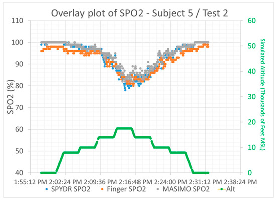 Exemplary overlay plot showing SpO2 output from SPYDR (blue), Nonin finger oximeter (orange), and Masimo forehead sensor (grey) show high degree of correlation between all sensors. Simulated altitude is shown as solid line at bottom (green), and all sensors performed as expected to reduced oxygen levels associated with changes in simulated altitude.