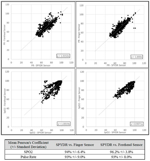 Figure 4 represents the correlation plot of SpO2 and PR for the SPYDR sensor versus the forehead and finger sensors. Data shown are compiled from all test subjects (n = 1070). Compared to the commercial forehead sensor, SPYDR had a Pearson’s coefficient of 96% for PR, and 92% for SpO2, suggesting that SPYR’s measurements were as accurate as both commercial sensors, showing a strong correlation. Correlation of SPYDR to the commercial finger sensor was 94.0% for PR, and 96.1% for SpO2.