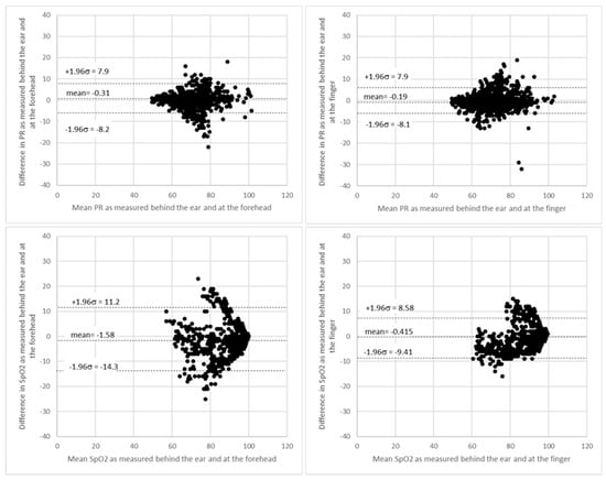 Bland–Altman plots of PR and SpO2 measurements comparing SPYDR with finger and forehead PPG. The x and y axes indicate the mean and difference of the photoplethysmography (PPG)-derived and the corresponding reference respiratory frequencies, respectively. The dotted lines show the mean bias. The limits of agreement (LoA) mean ±1.96 SD interval of difference are given with the solid lines.