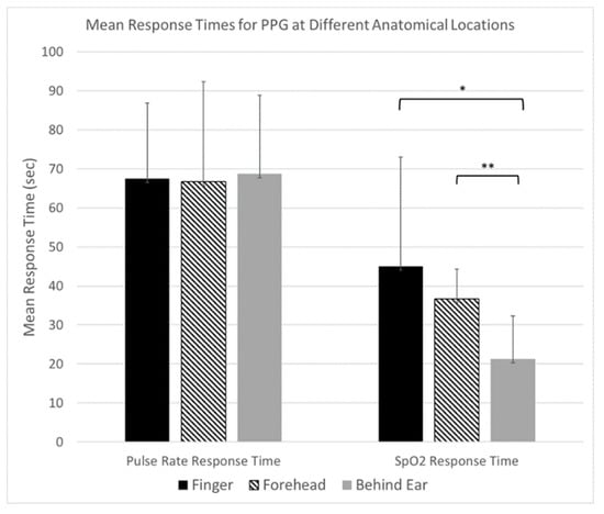 Mean response times comparison for all three locations of PPG readings upon administration of 100% oxygen following hypoxic conditions: Finger (black), Forehead (striped), and Behind the Ear (gray), for Pulse rate and SpO2 readings, showing similar response times for Pulse Rate and a significantly faster response time for SpO2 changes behind the ear location compared to both finger and forehead. * - p = 0.077 by students t-test, two-tailed, paired sample, n = 4 ** - p = 0.19 by students t-test, two tailed, paired, n = 3.