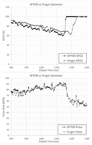 Figure 5 shows Bland–Altman plots of PR and SpO2 measurements comparing SPYDR with PPG readings at the finger and forehead. The x and y axes indicate the mean and difference of the PPG-derived and the corresponding reference respiratory frequencies, respectively. The dotted lines show the mean bias. The limits of agreement (LoA) mean ±1.96 SD interval of difference are given with the solid lines. ROBD test profile #3 simulated altitudes up to 25,000 ft. Following exposure to these hypoxic conditions, subjects were administered 100% oxygen. Importantly, the study shows a faster response time as seen by SPYDR to changes in SpO2, upon the administration of 100% oxygen following hypoxic conditions in the ROBD studies compared to the finger sensor in Figure 6 and Figure 7, while simultaneously closely recording the same values for pulse rate.