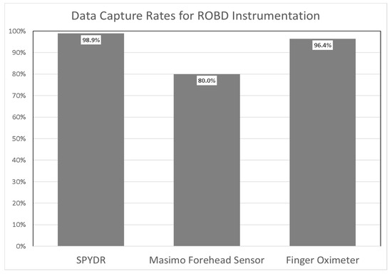 Data capture rates for SPYDR, Forehead, and Finger sensors used to monitor pulse rate and blood oxygenation (SPO2) during ROBD verification and validation. SPYDR capture rate was 98.9%, Forehead sensor was 80.0%, and Finger sensor was 96.4%.