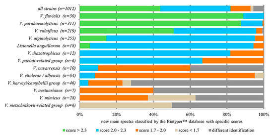 Classification of new main spectra with the Biotyper™ database. The highest matching scores of the new main spectra were divided into ranges reflecting highly probable species identifications (>2.3), probable species identifications (2.0–2.3), secure genus identifications (1.7–2.0), and unreliable identifications (<1.7). Strains with Biotyper™ species classifications are different from the species assignment for VibrioBase main spectra. (Re-printed from Erler et al. [28]. Copyright (2015), with permission from Elsevier).