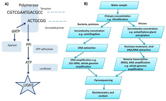 (a) Schematic illustration of the pyrosequencing reaction with four enzymes (DNA polymerase, ATP sulfurylase, luciferase, and apyrase). Nucleotides are added one at a time to form the complementary strand of the single-stranded template, to which a sequencing primer has been annealed. Each nucleotide incorporation event is accompanied by the release of pyrophosphate (PPi). ATP sulfurylase converts the PPi into ATP. The ATP is then converted to visible light by luciferase and the produced light signal is detected. Unincorporated nucleotides and ATP are degraded by apyrase between each cycle. (b) Major steps in the metagenomic detection of microbial pathogens in water by pyrosequencing. (Modified from Aw and Rose [38] Copyright (2011), with permission from Elsevier).
