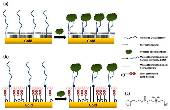 Self-assembled monolayers (SAMs) with DNA aptamers on a gold surface before and after incubation with PSA. (a) Thiolated aptamer with MCH; (b) amine-terminated aptamer with sulfo-betaine; (c) structure of the thiol-modified sulfo-betaine. (Re-printed from Jolly et al. [79]. Copyright (2015), with permission from Elsevier).