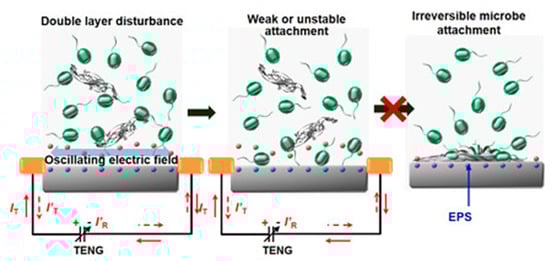 Schematic of a proposed anti-biofouling mechanism. Where an oscillating electric field exists, the surface double layer was disturbed leading to unstable organic and microbe attachment. (Re-printed from Long et al. [80]. Copyright (2019), with permission from Elsevier).