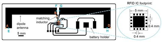 Tag design (110 mm × 35 mm) based on a development kit for printing onto different substrates. A to B and C to D show the longest path over which resistance measurements are made for each antenna arm, while E to F and G to H show the centre paths over which resistance is measured. (Re-printed from Smith et al. [86]. Copyright (2018), with permission from IOP Publishing Ltd.).