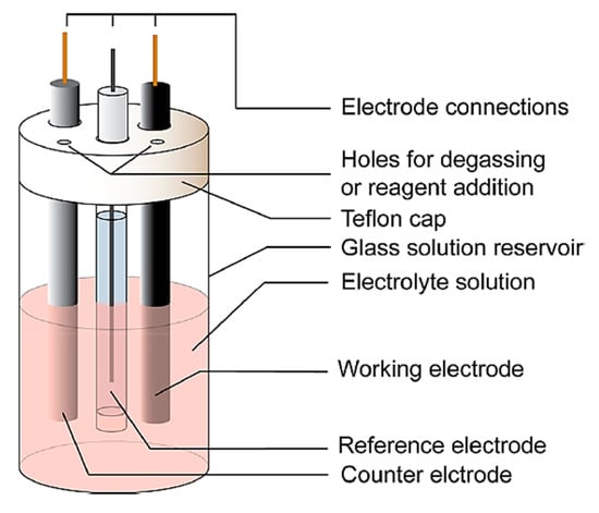 Typical 3-electrode cell setup with a working electrode usually made of gold, a reference electrode, which may be Ag/AgCl, Hg/HgSO4, or SCE, and a thin-wire Pt counter electrode.