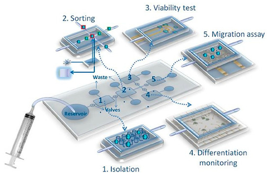Example of a modular lab on a chip for stem cell studies. Several microfluidic components and sensing modules are integrated together for cell isolation, detection and counting, viability or migration assays, and differentiation studies. (Re-printed from Primiceri et al. [111]. Copyright (2013), with permission from The Royal Society of Chemistry).