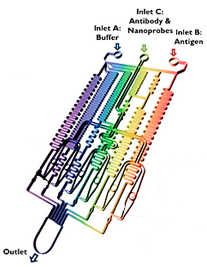 Some examples of micromixing techniques for reagent and sample homogenization include serpentine channel features as well as magnetic mixing using magnetized beads and sample through-flow [116]. A prototype device engineered by Lee et al. shows the fully automated gradient mixing of various solutions including measurement buffer, antibody-conjugated nanomaterials, and target antigen (see Figure 13) [117]. This microfluidic design embedded along with a gold-patterned microarray chamber for sandwich complex-based sensing achieved automated detection of multiple clinical biomarkers within 60 minutes.