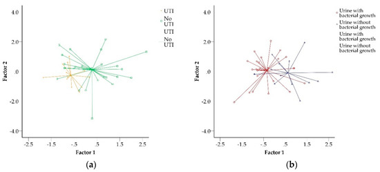Scatterplots of principal component analysis; Scatterplot for the discrimination of a chemical fingerprint as analyzed by electronic nose (eNose), based on urine samples with urinary tract infection (UTI) or without UTI (a), and urine with and without bacterial growth (b). Axes depict two orthogonal linear recombinations of the original 32 sensor data, designed to capture the highest amount of original data variance by means of principal component analysis. These variables are called factors. Individual volatile organic compound (VOC) profiles are illustrated as marked dots. The intersection of the lines deriving from the individual profiles shows the mean VOC profile.