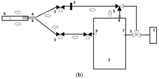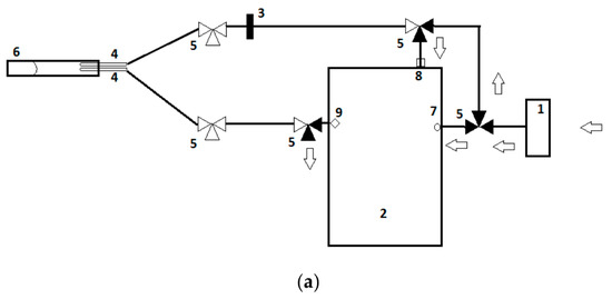 A schematic illustration of electronic nose setup during: (a) purging of the sensors and subsequently obtaining a baseline reference signal and (b) performing the actual sample measurement. A dark cone in a three-way valve (number 5) illustrates an air flow can pass, while a white cone prevents this. The arrows depict the air flow through the measurement setup. (a) First, the sensors are purged for 90” with filtered air derived from ambient air passing the A1-filter. The airflow, containing the residual volatile organic compounds (VOC), detached from the sensors, and is expelled through the exhaust port. Subsequently, a baseline reference signal is obtained in 30” using filtered air. (b) After the baseline reference signal is obtained, the actual measurement takes place in 60”. By rotating several three-way valves, a closed loop in connection with the fecal sample is formed (6). This loop prevents dilution of fecal VOCs with ambient air and, moreover, causes a continuous flow of fecal VOC passing the sensors. After the measurement, the three-way valves are rotated back to their original positions (Figure 1a) and the sensors are purged. (1) A1 filter, (2) Cyranose320®, (3) Polyethersulfone filter, (4) blunt needle, (5) three-way valve, (6) a vacutainer containing feces, (7) purge inlet, (8) sensor inlet, (9) exhaust portal, and (10) oxygen hose. Adapted with permission from Berkhout et al., 2016, Supplementary Material [54].