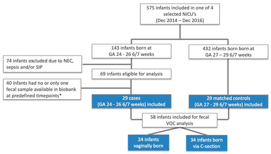 The first strength of this study is the prospective and standardized collection and handling of fecal samples by which we reduce the risk of potential pre-analytical errors [48,52,54]. A second advantage is that we have longitudinal samples from cases that were strictly matched to controls based on center of birth, and, thus, indirectly by center-specific treatment protocols. By this approach, we avoid a non-random distribution of factors already known for their influence on VOC, such as feeding type and center-specific environmental factors [48,54]. This is also expressed in the homogeneity in distribution of these variables between groups (Table 1 and Table 2). Lastly, by excluding infants with congenital gastrointestinal malformations and infants who developed LOS, NEC, SIP, and early onset sepsis, we exclude the measurement of disease-specific VOC.