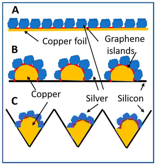 In order to collect molten copper in pre-arranged location for achieving uniformly distributed copper structures for subsequent chemical plating of silver nanoparticles, holes are chemically etched into a planar silicon wafer []. A sputtered copper film of thinner than 100 nm melts, flows and solidifies inside etched holes. Subsequent rapid thermal CVD of graphene on the ball-like copper bumps creates a template for the selective deposition of silver nanoparticles only on copper surfaces where there are no graphene islands to block the chemical plating of silver. Silver grows vertically from ball-like copper bumps surface to form a cluster of elongated nanoparticles pointing in different directions as illustrated by Figure 2C. Table 1 and Table 2 show the remaining detailed process parameters for hole etching, thermal annealing of copper thin films, and rapid thermal CVD of graphene islands on copper.