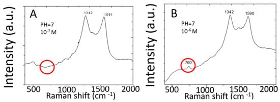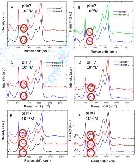 Figure 6C,D shows the Raman spectra measured by the same SERS sensors from two sets of adenine water solution of 10−11 M (Figure 6C) and 10−10 M (Figure 6D). Each set includes two water solutions, which are separately prepared. The SERS sensor clearly distinguishes adenine molecules of two different concentrations and shows similar Raman signal intensity for adenine of the same concentration.