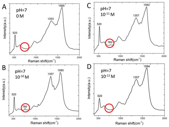 Raman spectra of adenine molecules in water having absorbed on SERS sensor surface: (A) 0 M; (B) 10−10 M; (C) 10−11 M; (D) 10−12 M.