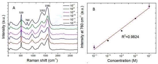 Raman scattering peak at 760 cm−1 measured from adenine water solution of the concentration ranging from 10−7 M to 10−12 M. (A) Raman spectra. (B) The Raman scattering signal strength at 760 cm−1 as a function of adenine concentration in water. The curve fitting shows a coefficient of determination (R2) being 0.9824.
