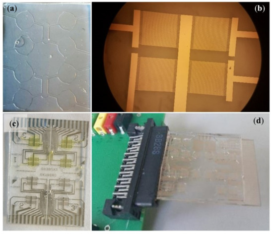 (a) Microfluidic modules for fluid handling consisting of four chambers per sides connected by a network of microchannels; (b) detail of the four interdigited electrodes available in each sensing area; (c,d) image of the lab-on-chip and its connection to the interface printed circuit board.
