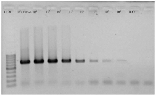 Agarose gel electrophoresis of polymerase chain reaction (PCR) sensitivity on bacterial isolates by Y45/Y46 primers.