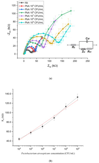As a first step, the sensing layer consisting of antibodies immobilized on the electrode surface was characterized to identify their impedance contribution. Anti- P. atrosepticum antibodies layer resulted in Ret ≈ 30 kΩ (dark gray line in Figure 4a). Then, to calibrate the sensors response, serial dilutions of P. atrosepticum in PBS (109, 108, 107, 106, 105, 104 CFU/mL) were prepared and tested. After incubation and washing steps, redox solution was added in the chamber and EIS measurements were collected. As shown in Figure 4a, a noticeable rise in impedance values with respect to the antibody baseline can be associated with incubation with a spiked solution on the sensing layer (colored curves) and impedance values are correlated with the bacterial P. atrosepticum concentration [C] in suspension (linearly in a Ret vs. log [C] plot) whose decrease results in smaller Ret values (Figure 4b). The suspension containing 104 CFU/mL was associated with Ret ≈ 42 kΩ (red curve), while the most concentrated suspension with 109 CFU/mL resulted in Ret ≈ 135 kΩ (light blue curve).