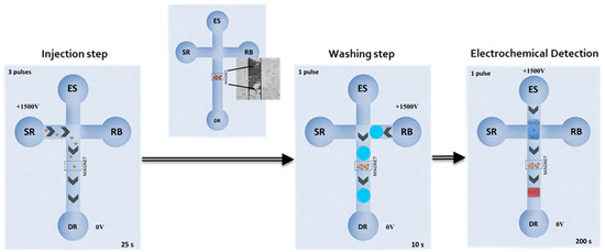 In this case, the MB immunocomplexes were re-suspended in 10 µL of PBST buffer for their subsequent electro-kinetical introduction into the microfluidic chip. Therefore, this suspension was deposited into the sample reservoir (SR) of the microfluidic chip (Figure 2). In addition, microchannels, the running buffer and detection reservoirs (RB and DR) were filled with PBST, while the enzymatic substrate reservoir (ER) was filled with a mixture of 45 µL of 1 mM HQ plus 5 µL of 50 mM H2O2.