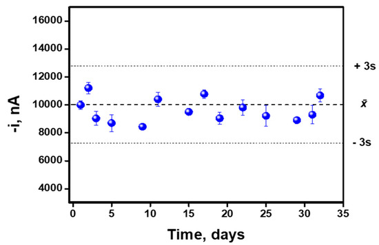 Due to its potential use as a POC, in order to simplify the entire procedure and, in turn, to reduce the final analysis times, the stability of the MB–captured antibody complexes was studied to be used as stock “reagents”. Their stability was studied at 4 °C during a period of 1 month using the on-drop SPE-C immunosensor approach. The control chart of the stability assay is shown in Figure 4, where each point corresponds to the mean value for three successive measurements performed in the same day (intra-day immunoassays). As can be seen, the immunosensor response remained inside the control limits placed at ±three times the standard deviation value calculated for the whole set of experiments, during the entire period of time checked (inter-day immunoassays, n = 14). These results demonstrate the excellent stability of the MB–cAb complexes.