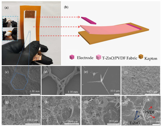 Structure of self-powered biosensor. (a) Optical image of the device. (b) Device structure. (c) SEM image of T-ZnO/poly (vinylidene fluoride) (PVDF)/fabric. (d) SEM image of organic fabric. (e) SEM image of one single T-ZnO. (f–j) High-power SEM images of T-ZnO/PVDF/fabric with different magnification.