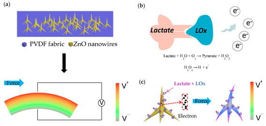 A working mechanism sketch (not corresponding to actual measurements) of self-powered biosensor has been shown in Figure 2. Figure 2a shows the power generation mechanism of T-ZnO/PVDF/fabric. At the beginning, the device has no piezoelectric output without applying external force. When it is deformed by external force, the PVDF film wrapped around T-ZnO generates an electric field on the stretching and compressing surface during deformation, and outputs piezoelectric voltage signal due to the piezoelectric effect [35]. The color legend of the rainbow presents the magnitude of the outputting piezoelectric voltage. The piezoelectric output of T-ZnO/PVDF nanocomposite film relies on the mechanical energy provided by the external force (monitoring object). Therefore, the piezoelectric can be regarded as a kind of signal of pressure. The whole sensing process does not need any external power supply. The enzymatic reaction of lactate and lacticoxidase (LOx) has been shown in Figure 2b. When lactate contacts with the enzyme, enzymatic reaction occurs, pyruvate and H2O2 will be generated first as follows [36]: