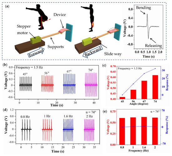 Figure 3 shows the self-powered biosensor for detecting angle and frequency in real-time. Figure 3a shows the measurement system, which aims to mimic the movements of joints. The inset shows the outputting piezoelectric voltage of one cycle. The optical photograph of this measurement system is shown in Figure S2 (Supplementary Materials). The outputting piezoelectric voltage of different mass fraction of T-ZnO is shown in Figure S3 (Supplementary Materials). When the mass fraction of T-ZnO is 66.7%, the device will output stable piezoelectric voltage. The little outputting piezoelectric voltage of pure PVDF is due to lack of the polarization treatment. The more T-ZnO leads to destroy the flexibility of this device. In order to assist the experiment with more accurate angle and frequency under control, the deformation is provided from a programmable measurement system. Figure 3b shows the outputting piezoelectric voltage of the biosensor against different angles (1.5 Hz). The outputting piezoelectric voltage of the device increases with the bending angle. When the bending angle is 45, 56, 67, and 74°, the outputting piezoelectric voltage of the device is 0.419, 0.485, 0.567, and 0.619 V, respectively. Figure 3c shows the relationship between the angle and the outputting piezoelectric voltage. The response of the device can be calculated from the following equation:
