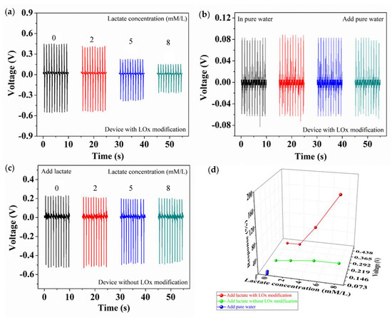 The biosensor performance for detecting lactate concentration is shown in Figure 4. The target solution (0.5 mL) was dropped on the test device, and the device is driven by the programmable measurement system (45°). Generated the piezoelectric voltage signal (Both as a power source and as a biosensor signal) through the piezoelectric surface coupling effect, the piezoelectric voltage signal can act as both a power source and a biosensor signal [43,44,45]. Figure 4a shows that the outputting piezoelectric voltage of the device decreases with the increasing in the lactate concentration. When the lactate concentration is 0, 2, 5, and 8 mmol/L, the outputting piezoelectric voltage of the device is 0.446, 0.404, 0.221, and 0.150 V, respectively. In order to confirm the piezoelectric surface coupling effect, two control groups have been designed as shown in Figure 4b,c. Figure 4b shows that the target solution is pure water, and the outputting piezoelectric voltage of the device with LOx modification is 0.081, 0.085, 0.083, and 0.080 V, respectively. Figure 4c shows that the outputting piezoelectric voltage of the device without LOx modification is 0.225, 0.21, 0.195, and 0.197 V, respectively. As a result, lower outputting piezoelectric voltage is contributed to the piezoelectric surface coupling effect. Figure 4d shows the outputting piezoelectric voltage and response of three devices. When the target solution of pure water is dripped on the device with LOx modification and the lactate solution of 0, 2, 5, and 8 mmol/L is dripped on the device without LOx modification, the response is not obvious. As the concentration of lactate is 0, 2, 5, and 8 mmol/L, the response is 0%, 10%, 100%, and 197%, respectively. This evidence indicates that the decreasing in the outputting piezoelectric voltage of the device with LOx modification goes hand in hand with the increasing in concentration of lactate, which is owed to the piezoelectric surface effect.