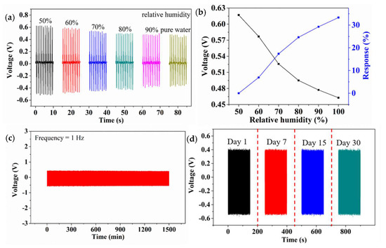 In the process of exercise, a large number of skeletal muscles participate in the work to generate heat, and the skin perspires in the temperature balance. So, the influence of relative humidity to the biosensor needs to be investigated. As shown in Figure 5a, the outputting piezoelectric voltage of biosensor decreases with the increasing relative humidity, until the relative humidity reaches 100% (pure water). Figure 5b shows the outputting piezoelectric voltage and response of the biosensor against different relative humidity. When the device is exposed to a humid environment, the water molecules will quickly occupy the available sites. The dissociative adsorption of the water releases electrons and protons to strong the piezo-screening effect, leading to the lower outputting piezoelectric voltage [46,47,48]. When the relative humidity is 50%, 60%, 70%, 80%, 90%, and 100% (pure water), the response of the device is 0%, 6%, 17.3%, 24.6%, 29.2%, and 33.3%, respectively. Figure 5c shows in the stability of the biosensor after continuous working for 1500 min. After 30 days, the outputting piezoelectric voltage is pretty much constant as shown in Figure 5d. It can be seen that the biosensor has good stability and repeatability and can meet the requirements of long-term sport training monitoring in real-time.