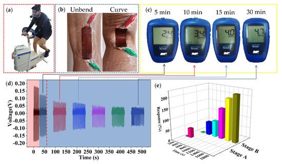 Figure 6 shows the practical application of biosensors for monitoring and verifying the MLSS. The tester is an excellent professional speed skater (male) and did not exercise or drink alcohol or caffeine for at least 24 h before this test. The power bike (Monark Ergomedic 839E, Stockholm, Sweden) integrates with a commercial sensor. Our biosensor is attached to the knee-joint, as shown in Figure 6a,b. The MLSS is 5 ± 0.5 mmol when the resistance of the power bicycle is 100 W and the speed is 60 rpm for 30 min at a constant pedal speed. Figure 6c shows that the blood lactate concentrations of the athlete are 2.4, 3.4, 4.0, and 4.7 mmol/L at the 5, 10, 15, and 30th min, respectively. Figure 6d shows the piezoelectric voltage output of the biosensor at the 5, 10, 15, 20, 25, and 30th min. It should be pointed out that the abrupt change of the fifth minute (red area) is due to the sweat. After perspiring (blue area), the outputting piezoelectric voltage of our biosensor is dependent on the lactate concentration. As blood lactate value (collect fingertip blood) is 2.4, 3.4, 4.0, and 4.7 mmol, the output piezoelectric voltage is 0.122, 0.074, 0.069, and 0.038 V, respectively. Through outputting piezoelectric voltage of biosensor, it can be observed that the piezoelectric output tends to be steady after 15 min. This result conforms to the commercial sensor and this physiological phenomenon conforms to the range of MLSS (±1 mmol) [41,42,49]. Figure 6e shows the response of the biosensor during the test. Stage A is the response of the biosensor in the stage from non-sweat to sweat due to the change in relative humidity. When the piezoelectric voltage is 0.177 and 0.122 V, the response is 0% and 45%, respectively. Stage B is the response of biosensor for detecting lactate concentration of sweat. When the voltage is 0.122, 0.074, 0.069, 0.05, 0.041, and 0.038 V, the response is 0%, 63.9%, 77.2%, 144.8%, 197.4%, and 220.8%, respectively. These results show that it is feasible to monitor the MLSS in our biosensor. So, a multifunctional, flexible, portable, non-invasive, and self-powered biosensor based on PVDF/T-ZnO/Lox-modified nanocomposite film has been constructed to monitor the MLSS during exercise. Although the biosensor is not yet up to industry standards, it is hoped that the concept of portable biosensors will help many people in the need to formulate exercise prescriptions through further development in the future.