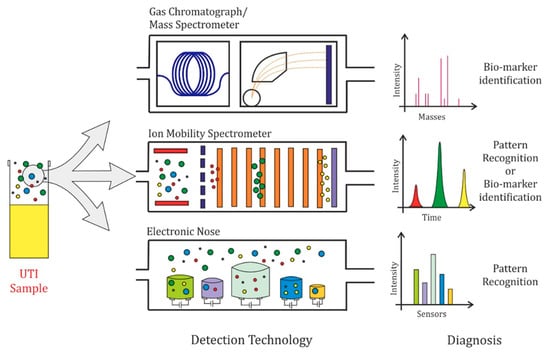 Following GC-MS methods, eNose and IMS technologies were evaluated for the diagnosis of UTI. A common criticism of eNose and IMS technology is that they are unable to determine the identity and concentration of individual VOCs, except for combined-technology instruments [60]. It has therefore been argued that this “black box” approach relies too heavily on pattern-recognition algorithms [157]. Moreover, this method cannot yield a targeted VOC biomarker test for the diagnosis of a particular condition or disease [158]. In this case, it is true that the eNose approach cannot identify unique biomarkers for UTI. However, it should be noted that unique biomarkers do not necessarily exist for individual UTI pathogens and that even if they did, they would be included as a constituent of the overall pattern analysed by the algorithms. Furthermore, as indicated in this review, pattern recognition has already demonstrated potential in determining the status of a sample and recognised the relevant pathogen, without VOC identification. Another disadvantage associated with eNoses is that, compared to classic culture, there is a lack of antibiotic resistance data. In future, it may be possible to use eNoses on urine samples, with antibiotics added to them for a period of time, to identify if a strain is susceptible or resistant. This information could drastically reduce the test time, from the current standard of 24–72 h. If this is not feasible, local antibiotic resistance profiles and data from clinical laboratories could be used to make predictions and recommendations for appropriate treatments, once a pathogen has been identified in a urine sample. Moreover, the classification of growth phase is possible and this can be used to calibrate the antibiotic dosage for treatment [129].