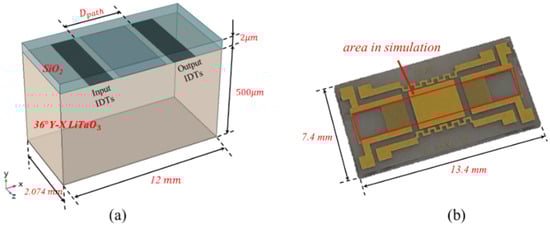 (a) Three-dimensional model of the device used in numerical simulation. (b) Fabricated SH-SAW chip without SiO2 layer. The selected area for simulation is marked with the red rectangle.