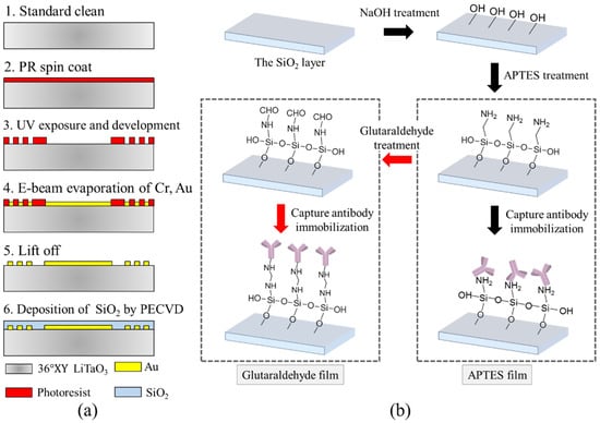 After dicing the wafer, chips were rinsed with standard clean solvent and blown dry with nitrogen. To capture specifically and selectively the target protein, the surface of the sensing section was functionalized. The surface modification process for the SH-SAW chip is illustrated in Figure 2b. The device was first treated with hydroxide by immersing in NaOH (1 M) for an hour. The sensing surface was then silanized by immersing it in a solution of 3-aminopropyltriethoxysilane (APTES, 0.5%, Sigma, A3648) in ethanol (99.5%) for 12 h. After rinsing with pure ethanol and drying with N2, the SH-SAW chip was baked in an oven at 95 °C for 2 h to complete the APTES modification of the sensing film.