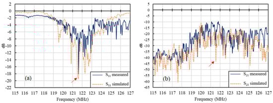 Comparison of (a) S11 and (b) S21 between simulated and measured frequency responses in the range of major resonance frequencies. Arrows indicate the location of center frequency.