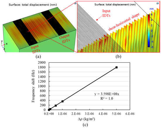 Numerical results of the eigenmode response displacement of the device are shown in Figure 5a. The profile of the acoustic wave in the x-y plane along the centerline of the device in the x-coordinate and near to the input IDTs is shown in Figure 5b. From the piezoelectric displacement, it is obvious that the surface acoustic wave generated is in shear-horizontal shape. For a SAW-based biosensor, sensitivity is an important performance parameter. To attain information regarding the sensitivity, the surface mass density (, kg/m2) of the sensing surface was varied in the simulation to determine the corresponding frequency shift. As shown in Figure 5c, for the surface mass density that was varied from 0 to 5 × 10–6 kg/m2, a nearly linear dependency between the frequency shift (Δf) and the incremental surface mass density Δ was observed. The slope of the plot represents the mass sensitivity, which is 3.598 × 108 Hz∙m2/kg in the current configuration. It should be noted that, to attain the amount of Δ for a specific SH-SAW sensor corresponding to the concentration of the target molecule, a mass transfer analysis incorporating the surface absorption and adsorption of the molecule on the sensing film is generally required. Here, we proposed an alternative approach to determine the incremental surface mass density with respect to the biomolecule concentration by applying the relationship as follows:
