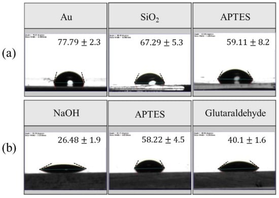 Figure 6a shows variation of the water contact angle on the sensing film before and after the APTES modification. The contact angle of the gold layer reduced from 78° to 68° after being coated with a silicon dioxide guiding layer. After it was modified with APTES film, the water contact angle further reduced to 59° and the surface became more hydrophilic. This contact angle is consistent with results reported in the literature [].