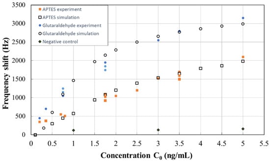 The simulated frequency shift corresponding to the mass loading of the sensing film, as shown in Figure 5c, can be converted to the dependency of frequency shift on EGF concentration by using Equation (5) in conjunction with the experimental results shown in Figure 7. The measurement results of those two sensing films were used to evaluate k1 and k2, respectively, and the results are shown in Figure 7 in comparison with the experimental data. Empirical coefficients are determined to be k1:3.7 × 10–8, k2:0.89 for the glutaraldehyde film and k1: 2.35 × 10–8, k2: 1.48 for the APTES film. It is seen that the proposed model for converting the incremental surface density (Δρ) to the EGF concentration (c0) as in Equation (5) yields a good agreement of the simulation results with the experiments. From the semi-empirical model, the sensitivity level is found to be 0.641 and 1.709 kHz/(ng/mL) for APTES and glutaraldehyde sensing films, respectively, at a biomarker concentration of less than 1 ng/mL. Although the estimated frequency shift at low EGF concentrations deviates from the experimental results, the clear response suggests that the SH-SAW sensor and the model are applicable to the analysis of samples with low EGF concentrations. In particular, this model provides an effective simulation model for the frequency response to the EGF concentration without the requirement of solving the detailed transport and adsorption of the biomolecules on the sensing surface. In this way, the response of the SH-SAW sensor to the concentrations of targeted biomolecules can be quickly evaluated from the simulation once those empirical coefficients are determined.