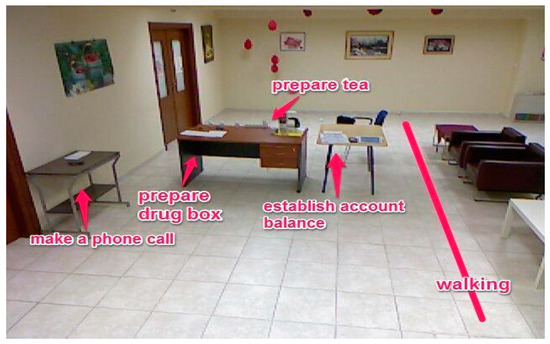 The Thessaloniki scenario was the same as the Nice scenario, with minor changes in each task (e.g., position of the items) and additional sensors. The goals of the protocol were (a) to support clinicians in the assessment of autonomy and functionality in daily activities of dementia patients, (b) to investigate the accuracy and the effectiveness of the system. We selected specific activities for the evaluation which were found to be particularly deteriorated in the AD spectrum and specifically in the preclinical stages since they constitute complex ADLs and engage several cognitive functions (e.g., executive function, financial capacity, medication treatment) instead of simple ADL activities which play a pivotal role in more advance stages (e.g., use of the bathroom, preparing the bed, getting on and off a seat). There are two types ADLs than can be distinguished [39]. The first category is called “Basic ADL” and includes activities such as eating, bathing, dressing up, and mobility, which is considered to be widely preserved in MCI population. On the other hand, IADLs are usually deteriorated in the course of cognitive decline [40]. In particular, IADLs incorporate activities, for instance, related to shopping, meal preparation, managing finance, using the telephone and transportation and taking of medication, and other several daily activities that engage complex cognitive functions [41]. Therefore, in the lab assessment, we included “Semi-directed” IADLs since we examined people with MCI and mild to moderate AD, in order to assess the autonomy of the participants and their performance in ADLs. The participant had to correctly perform a list of daily tasks within a timeframe of 8 min. For this step, the participant was alone in the experimental setting and could refer to the instruction sheet at any time. The clinical protocol contained the following activities: