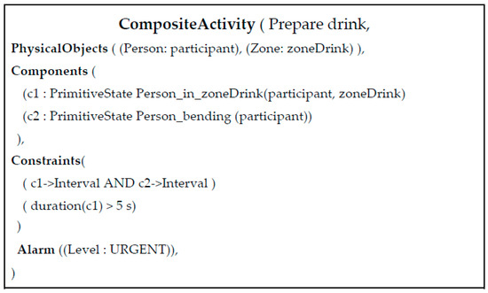 An IADL model consists of the enumeration of physical objects (e.g., detected people, room furniture and objects) and sub-events that intervene in the targeted IADL. Sub-events are intermediate activities (steps) that a person realizes to accomplish a more complicated task, in this case an IADL. An IADL model also contains constraints that define rules over sub-events and physical objects, like the order that two sub-events should appear in time to be a valid instance of the targeted activity. Figure 5 presents the event model of the “Prepare Drink” activity. This model has two sub-events (components): one sub-event that verifies whether the person’s global position is located in the spatial location where drinking objects are generally placed (named Person_in_zone_Drink), and a second sub-event verifying whether the person displays the posture “bending” (named Person_bending). The first constraint (or rule) of the model defines that both sub-events must be performed by the person at the same time (c1->Interval AND c2->Interval). The second constraint establishes that the sub-event “Person_in_zoneDrink” must have been performed by the participant for at least 5 s to characterize a “Prepare drink” event. Once both constraints are satisfied, the event starts to be recognized by the CAR. A more detailed description of the IADL analysis can be found in our recent study [42]. In detail, Figure 5 illustrates the monitored scene annotated with the semantic data deployed for event recognition and modeling, whereas the left picture image shows the “preparing tea” event.